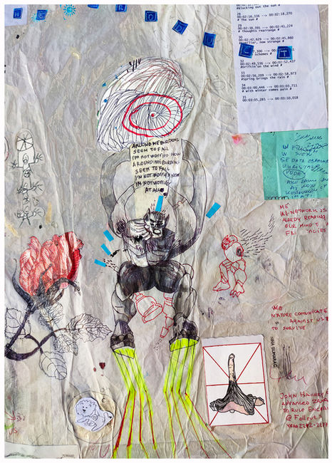 In my studio, I maintain several working surfaces: a table with my laptop, another for reading and writing, and tables where I teach students. For years, I have covered each with protective white wrapping paper. Over time, these papers become stained and marked—inks, lines, colors accumulate alongside captured thoughts, visual maps, fragments of ideas, sometimes lyrics. A detail extends into a drawing. Newspaper clippings adhere. Sketches of political figures appear beside notes on gender abuse, mining conflicts, media manipulation, and human existence. Plans for future projects mingle with inner perceptions, dreams, and everyday debris.